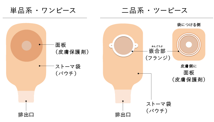 ストーマ装具の種類は、面板と袋(パウチ)が合体した単品系(ワンピース型)と面板と袋が分かれた二品系(ツーピース型)に大別されます。