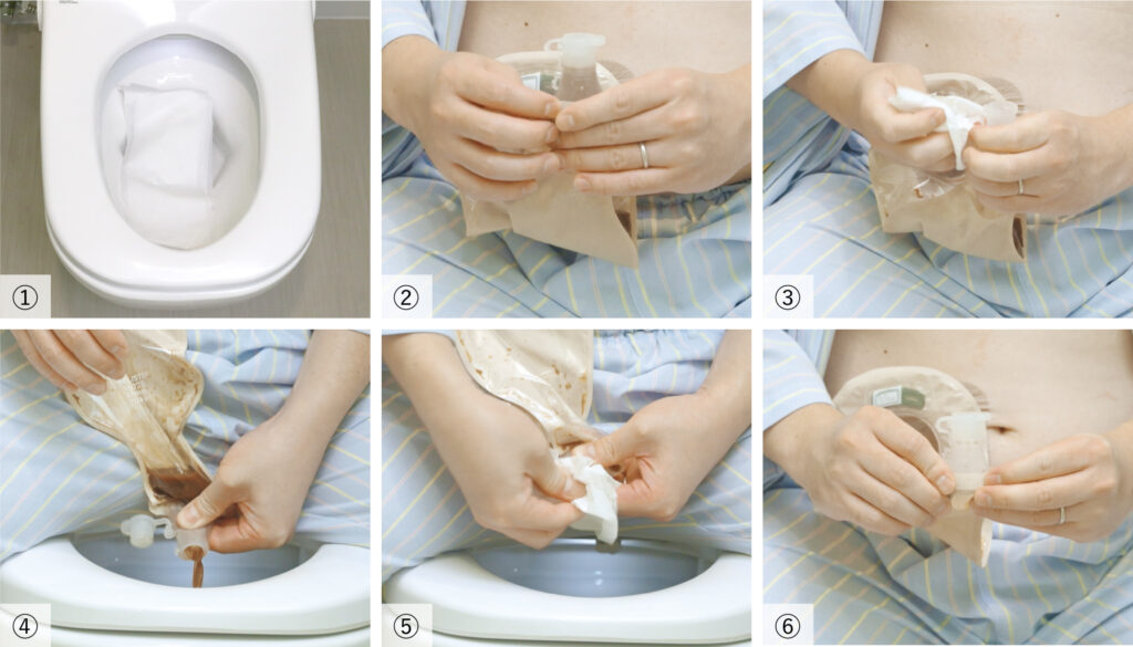 開放型の場合は、排出口を排出する場所に向け、排出口を開き便を押し出すようにして排出します(②)。排出口の部分に便が残らないようにするため、排出口の先端をトイレットペーパーなどできれいに拭きます(③)。さらに、臭いや汚れがつくのを防ぐため、「消臭潤滑剤」をストーマ袋(パウチ)に注ぎ足しましょう(④)。排出口を閉鎖し(⑤)、「消臭潤滑剤」をストーマ袋になじませます(⑥)。