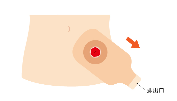 介護者がストーマ袋(パウチ)からの排出のケアを行う場合や、臥位(横になった体勢)での時間が長い場合、排出口の向きがやや外側の向きなるように装着するとケアがしやすいです。
