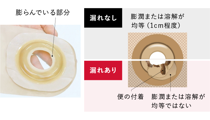 面板の裏面の皮膚保護剤の溶け具合(膨らみ具合)を確認します。面板の膨潤(膨らみ)、溶解(溶け)が1cm程度に均等な場合、漏れはないと考えられますが、膨潤(ふくらみ)または溶解(溶け)が均一でない場合、漏れが発生している可能性がありますので、ストーマ外来や専門の看護師に相談し、装具変更やアクセサリーの併用の検討をします。また、膨潤(膨らみ)または溶解(溶け)がいつも以上に進んでいる場合は、交換を早めることをおすすめします。