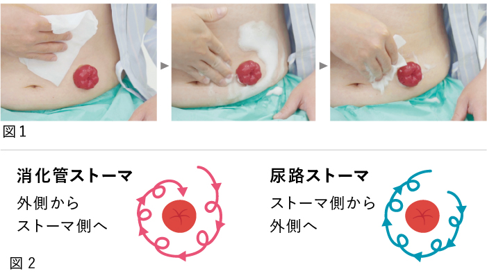 消化器系ストーマの場合は、ストーマから離れた部分からストーマ近接物に向かって洗います。尿路系ストーマの場合は、ストーマ近接部から外側に向かって洗います。(図2)