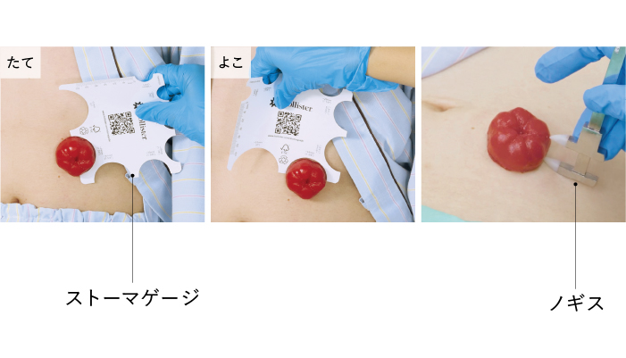ノギスやゲージを使い、ストーマのサイズ(たて、よこ)を測ります。