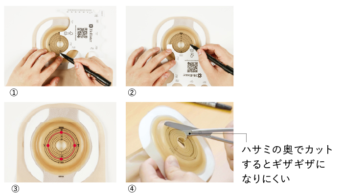 フリーカットの面板の場合、自分のストーマにあったサイズにカットすることが必要です。計測したサイズに合わせて、ペンで面板のたてとよこの各2か所に印を付け(①②)、ストーマの形となるように4か所をつなげます(③)。装具をまわしながら渦巻きのようにカットします(④)。