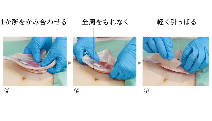 面板とストーマ袋(パウチ)に丸い嵌合部のリングがついています。それぞれのリングを合わせて、まず1か所指で押してパチッとかみ合わせます(①)。その後全周をかみ合わせて行きます(②)。かみ合わせ終わったら、ストーマ袋(パウチ)を軽く引っぱり、きちんとくっついているか確認します(③)。