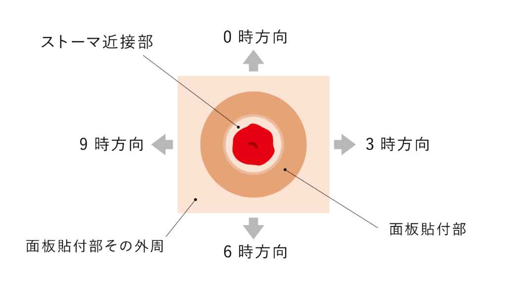 ストーマ周囲の呼び方は、ストーマに近い方から、ストーマ近接部、面板貼付部、面板貼付部その外周と呼びます。