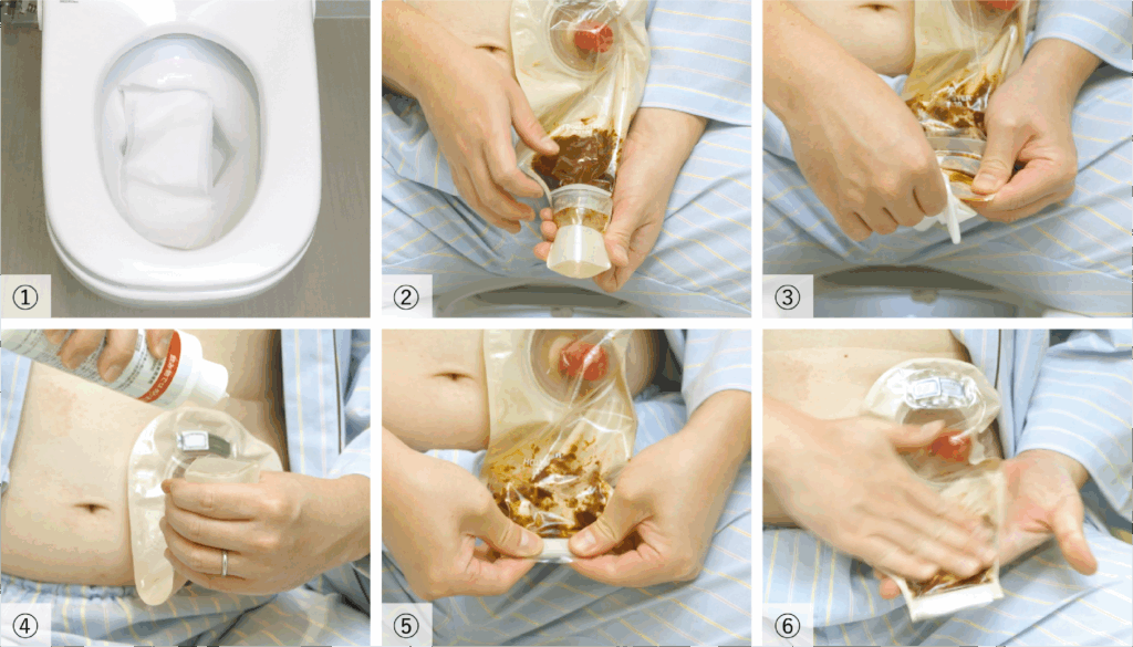 ストーマ袋(パウチ)内の排泄物はすべてトイレに排出してから、破棄します。空になったストーマ袋(パウチ)はお住まいの自治体のごみ処理方法に合わせて破棄してください。見えないように新聞紙などに包んだり、排泄物や臭いが漏れないよう、ビニール袋に入れて固く口を縛っておくとよいでしょう。