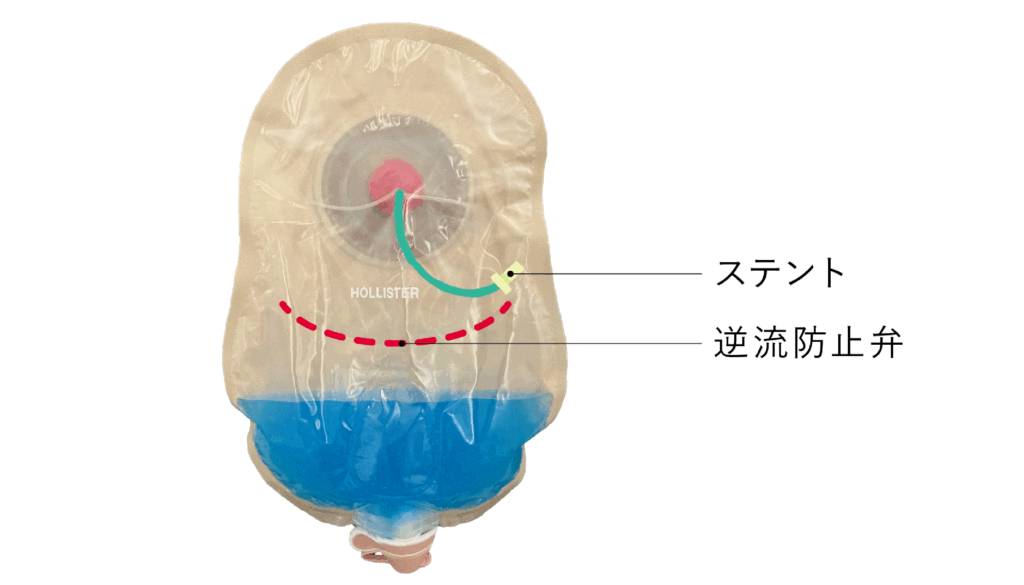 尿路系ストーマでカテーテル(ステント)が入っている方は、カテーテルは、逆流防止弁を超えて下方向に留置しますと、感染症の原因になるため、逆流防止弁より上にあるように注意しましょう(下写真参照)。