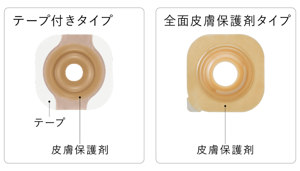構造の種類は、外縁部にテープがあらかじめついているテープ付きタイプと、全面が皮膚保護剤のタイプがあります。テープ付きタイプは外側からめくれにくく、密着感を感じられます。