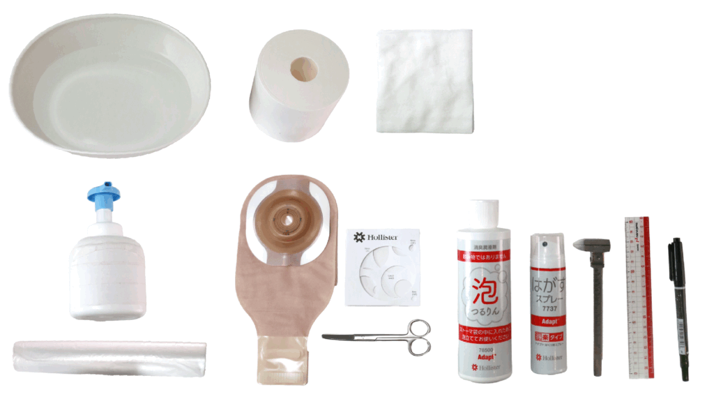 ストーマ装具、ガーゼまたは柔らかい布、ペーパータオルなど、トイレットペーパー/ティッシュ、ゴミ袋、ぬるま湯、洗面器、ストーマのサイズを計測するもの(ゲージ/ノギス/定規など)、せっけん/清拭・洗浄料、はくり剤、(必要に応じて)消臭潤滑剤、はさみ※、油性ペンまたはボールペン※(※面板がフリーカットの場合のみ)
