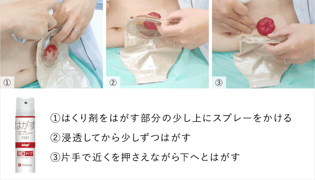 使っている装具をはがし、新しい装具へ交換することを「装具交換」と言います。ストーマ袋の汚れ、面板、皮膚の状況に応じて行い、基本のサイクルは毎日~数日に1回です。