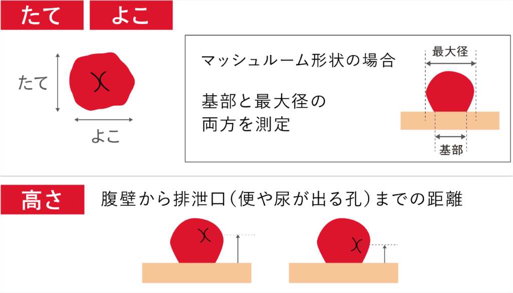 ストーマの高さは、排泄口までの高さを測ります。ストーマのサイズは変化するので、漏れなどの予防のため、定期的に計測することが望ましいです。