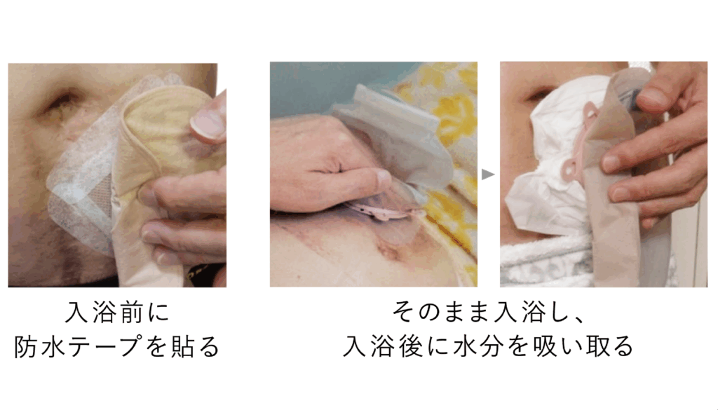 あらかじめテープの付いた装具を使用してそのまま入浴しています。入浴後は、濡れた不織布の水気をティッシュペーパーやキッチンペーパー、タオルなどで吸い取ります。(5~6分で乾きます。)どの入浴方法が正しいということはありません。ご自身が安心できるスタイルを見つけてお風呂を楽しめるようになってほしいです。