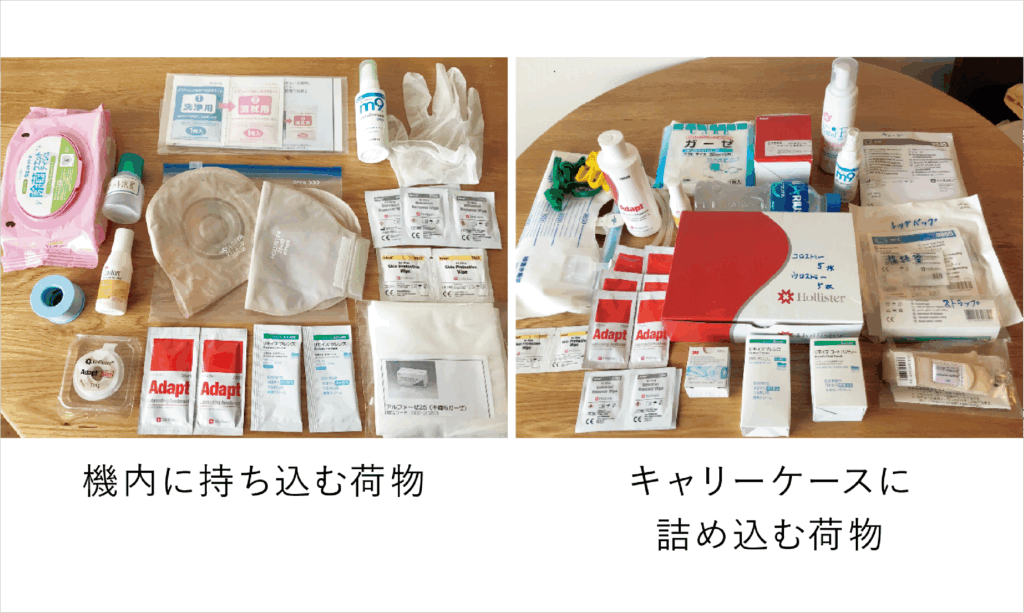 機内での交換やキャリーケースの紛失に備えて、ストーマ装具や補助用品の一部は機内に持ち込みましょう。ハサミは機内に持ち込むことができませんのであらかじめストーマサイズに合わせてカットしておきましょう。