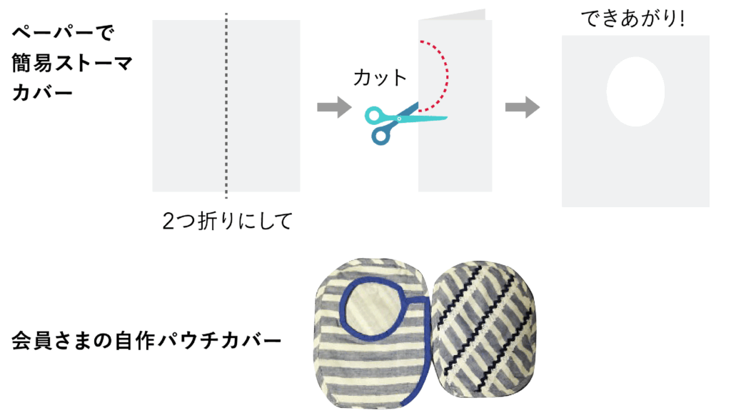 ティッシュペーパーやキッチンペーパーなどを2つ折りし、面板とストー袋(パウチ)の部分にあうように穴を開ければ、簡易ストーマカバーのできあがり。洋服とストー袋(パウチ)との間に挟んで汗を吸収。安上がりなのに汗をよく吸い、使い捨てできるので便利です。また、市販のパウチカバーや自作でパウチカバーを作っても良いですね。市販のものは防臭効果があるものもあるので、便利です。