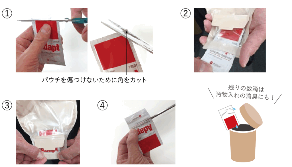 パックを下から巻き上げ、消臭潤滑剤をパウチの中に絞り出します(③)。注入後はパックをパウチから取り出し、再びはさみを数か所入れて(④)トイレの汚物入れに。 無駄なく、最大限有効活用しています!