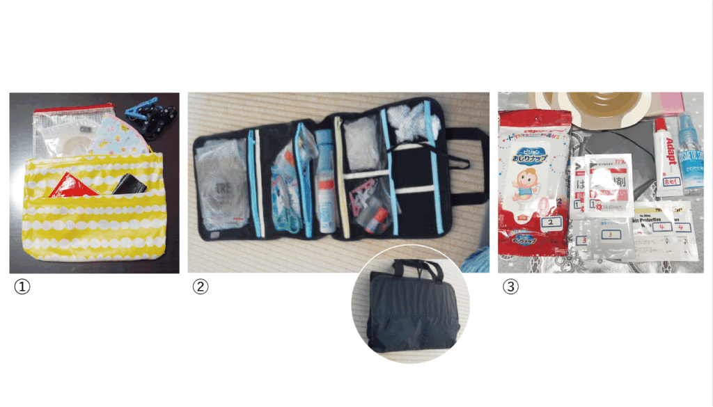 外出先で不慮の漏れや、慣れない場所での装具交換に不安を感じて外出を躊躇してしまうこともあると思います。外出の際には、装具交換できるものを持ち歩くと便利です。事前に準備して、安心して外出を楽しみましょう。