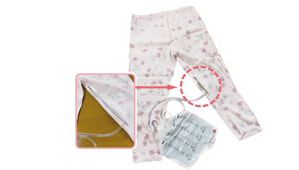 夜間の大型バックのチューブがパウチよりも上に来ていると、排泄物がうまく流れず、漏れの原因になっていました。そこで、チューブを足の下に通せるようにパジャマのズボンにファスナーを付けました。ァスナーの引手(開口部分)が下にくるように付けるとチューブが下にいき、うまくバッグへ流れてくれます。